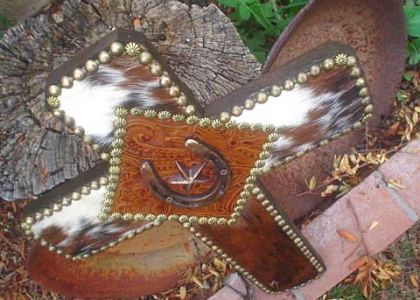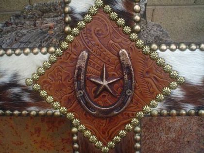 Large Cowhide And Leather Cross With Horseshoe & Star $121.00 Read more about Large Cowhide And Leather Cross With Horseshoe & Star